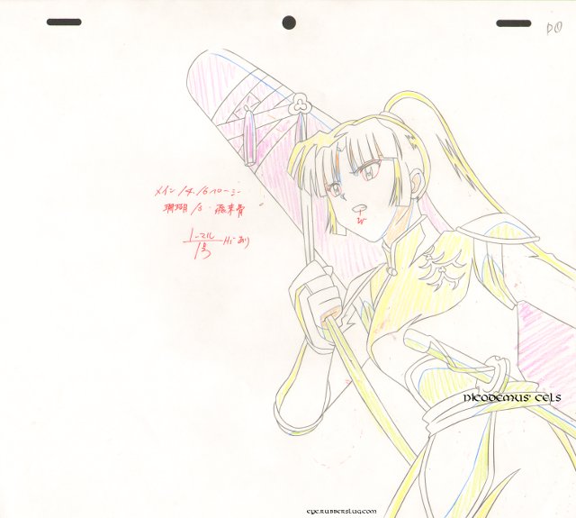 It is indeed a tense moment, as our heroes believe Sesshomaru is about to off the downed Inuyasha. From episode 52 "The Demon's True Nature" "Tomerarenai! Yōkai no Honshō" (止められない! 妖怪の本性.)A Beautiful cel! Background in the DVD is blue sky with clouds... oo, I wonder if I have one of those? Stock background that matches really closely (wasn't difficult!) If anything it might have a shade too much blue. There were 3 sketches, I combined 2 of them into 1 so I could show them all (Miroku & Shippo. Not sure why they are A1,B1 and D1 (no C1) but nothing seems to be missing. The cel numbers are circled on all 3 sketches (key cels.) Thanks Denise!